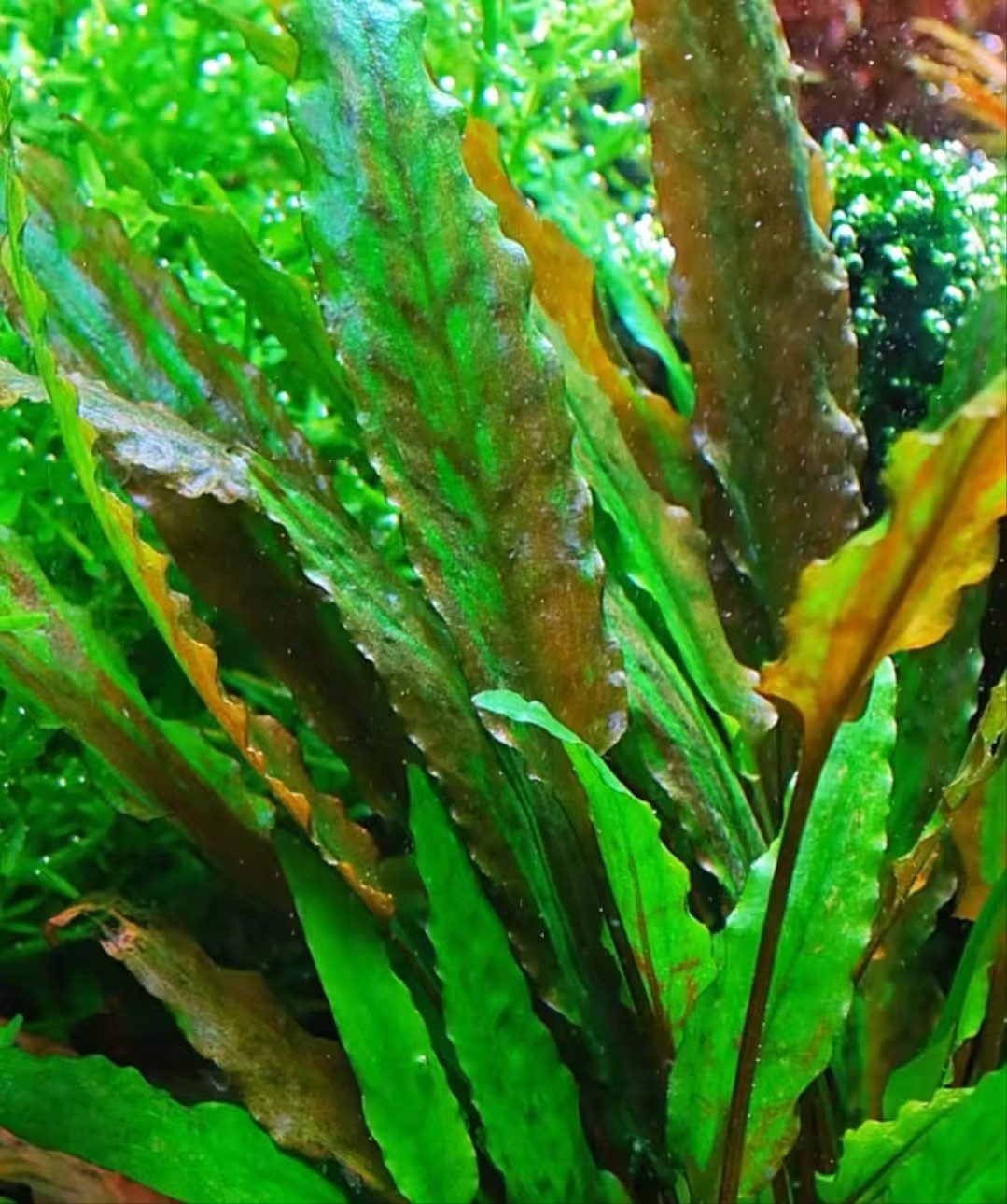 叶片呈长卵形或披针形,边缘有独特的波浪褶皱,这是其最显著的识别特征。颜色丰富,因品种和养殖条件而异。绿温蒂是最常见的品种,叶片为翠绿色。棕温蒂的叶片呈棕色或古铜色,叶背常为紫红色。红温蒂在强光、适当养分和较低水温下,叶片可呈现出粉红至深红色。温蒂的植株属于丛生型水草,无茎。叶片从基部的匍匐茎 (走茎) 上直接长出,能通过走茎向四周蔓延繁殖,形成茂密的群落。它们根系发达,对固定和吸收养分至关重要。
